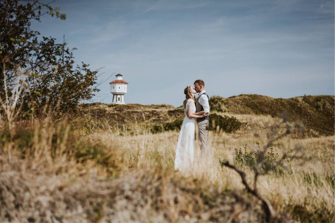 Der Weststrand mit seinem feinen Sand, den weichen Dünenlinien und dem historischen Wasserturm im Hintergrund bietet eine perfekte Kulisse für eure Hochzeitsbilder.